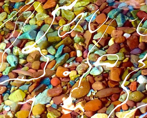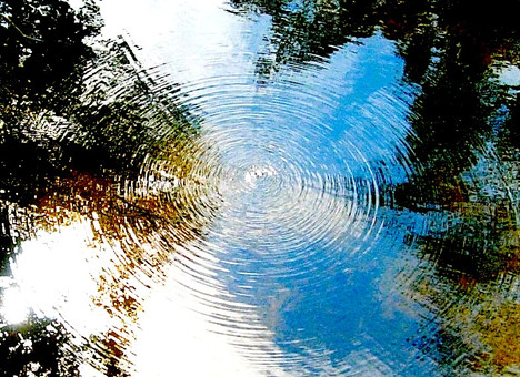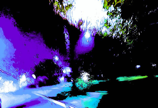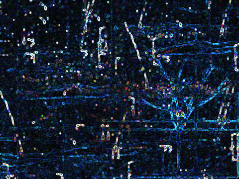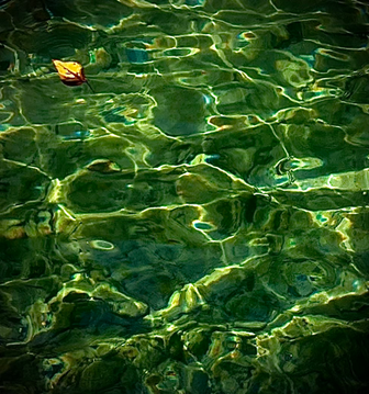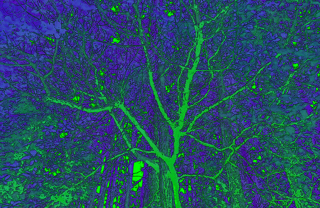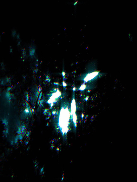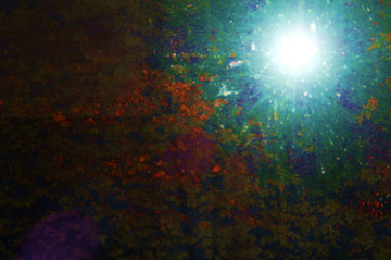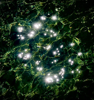Tree reflected from river surface in the shadow under a bridge. The nightime star-like effect is from floating leaves.Related content
