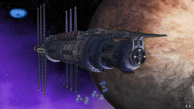 At just 60 meters in diameter, this is the smallest type of Terran vessel capable of independent operations. Typically, they are classified as corvettes and attached directly to planetary bases or heavy fleet carriers. In this case, they are counted directly as part of their mothership's or base's complement. Some vessels of the same size are sometimes classified as ultra-light cruisers, owing to their differing equipment and independent deployment.Depending on the class, Terran corvettes fulfill a variety of different roles, ranging from courier ships to escorts, militia vessels, and heavy strike craft. In fleet actions, these ships are usually deployed in packs of ten, using high coordination and formation maneuvers to maximize their mobility and firepower.