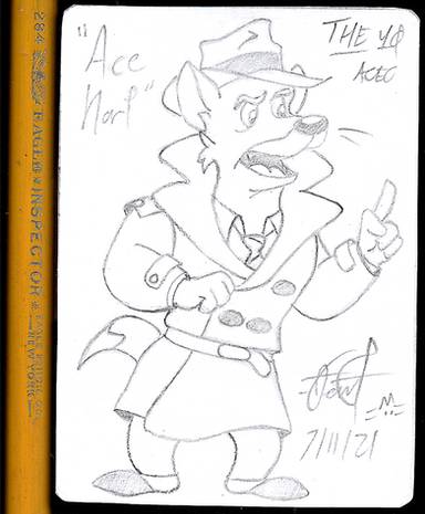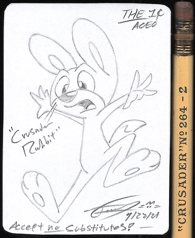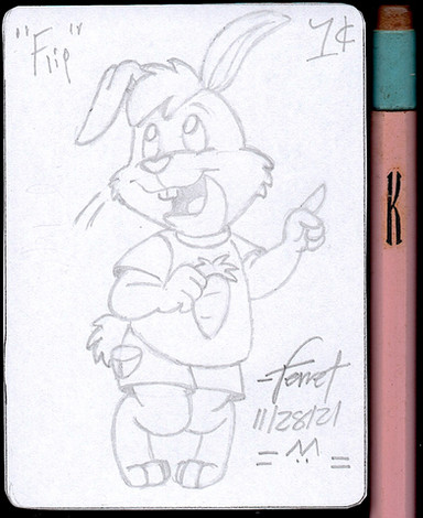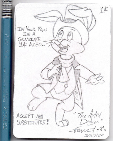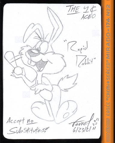 I had to play with proportions a bit in order to fit Dr. Rabbit on this ACO ...consequently, I don't care very much for this card, but I didn't want to draw the character again today. Why?I made seven practice sketches, most of which had good line art, but didn't fit the dimensions of ACO. Eventually, I lost interest in creativity and just redrew this stock image of the character. (I've been drawing 'bigger' lately; no idea why).
