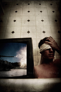 do you know what's so amazing about this piece, it's the blurry head, it's as if the light is to attracting and blinding that it drives the person crazy. also it give the feeling of being trapped, seeing the light and not being able to reach it. great work, great idea, great quality.