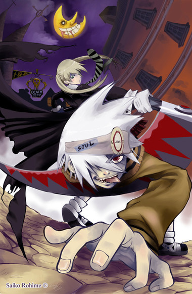 Uhuhuhuh, we dont know what's happening, but probably Maka is falling from somewhere...And Soul, is returning to his normal shape to prevent the fall of his companion.