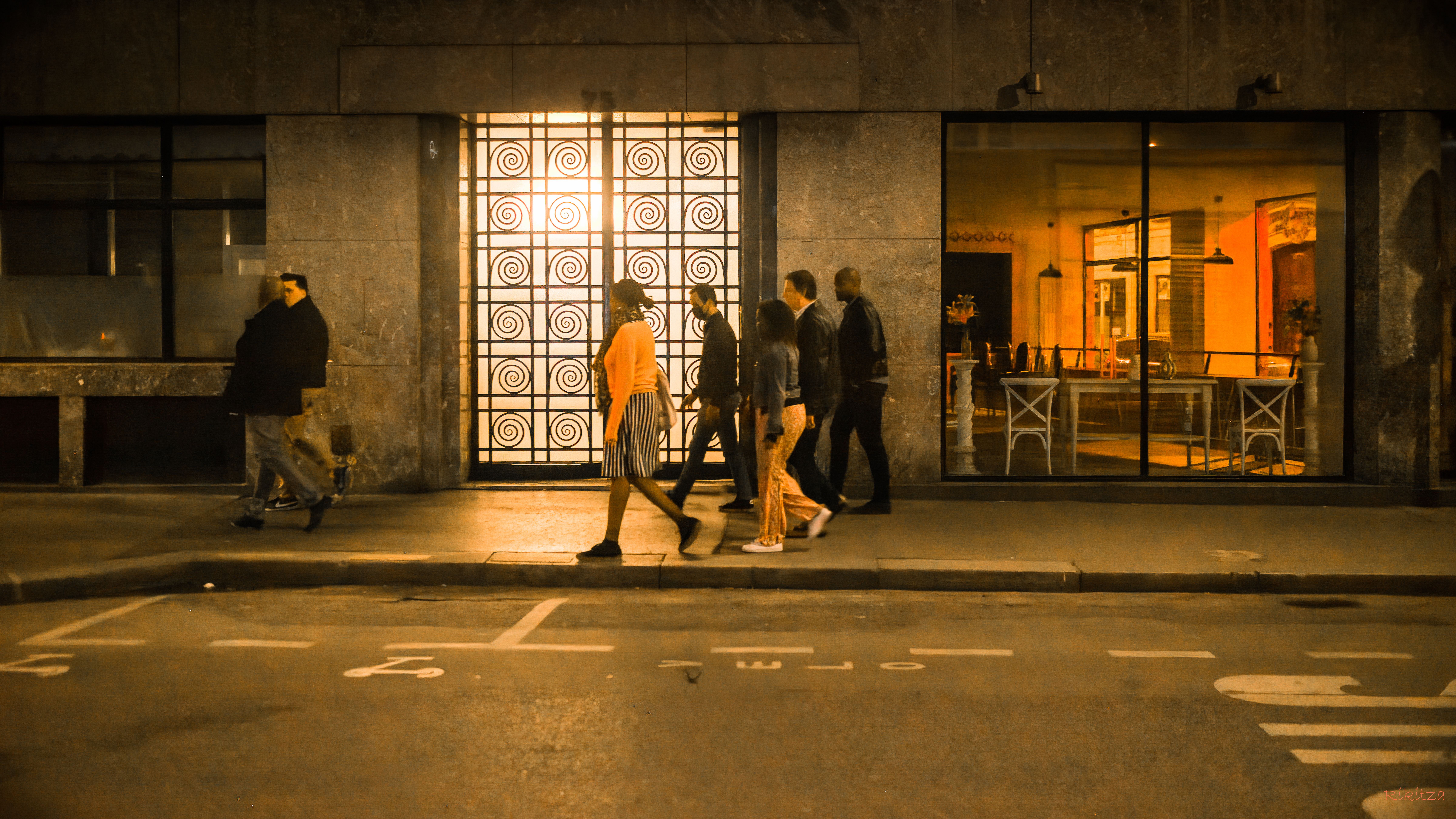 The colours are hot and energetic with a nice ice blue to contrast, which adds to the composition and sense of setting -- city life, moving forward. Without that neon blue it would be much less effective, I think.
