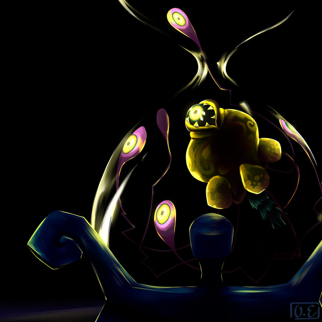 Lovely, as always, but there is a bit of a problem, mostly regarding portrayal. Β Spiritomb, normally, is almost simply an aura hanging around the stone to which it is bound, however, here it appears almost physical, as if some sort of cyclone of smoke escaping from that stone rather than hanging around it. Β In fact, it kinda looks like Genie from Aladdin, now that I think about it.