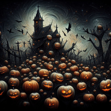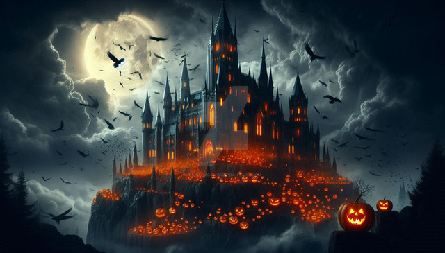 A scary pumpkin field in the vicinity of some spooky castles.Generated in Midjourney