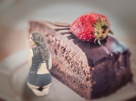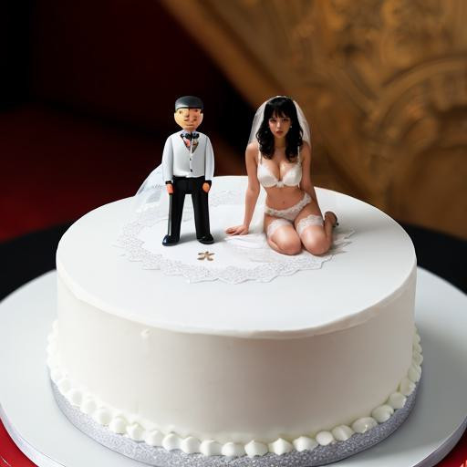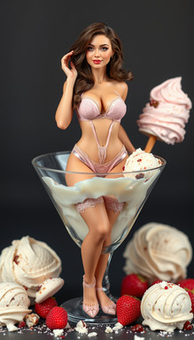 Shrunken woman in sexy lingerie posing with slice of cheesecake on plate. AI image