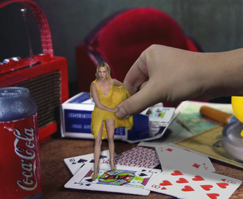 Paper Doll is an offshoot of Paper Child photography. Instead of a drawn picture (which Paper Child is) I use a cut photograph and integrate it with the scene. This accomplishes a number of things. First, with just one light I can make an actual shadow before the image goes through manipulation. Second, it allows me to set the scene to my liking, including placement of items and composition. Third, with shadows out of the way all I need to do is integrate our lovely subject into the scene, significantly cutting down on needed manipulation.