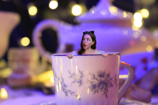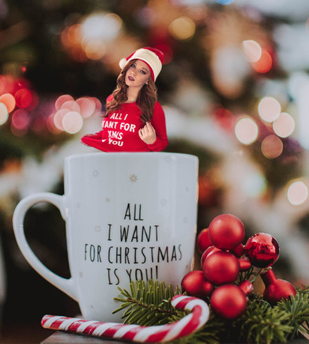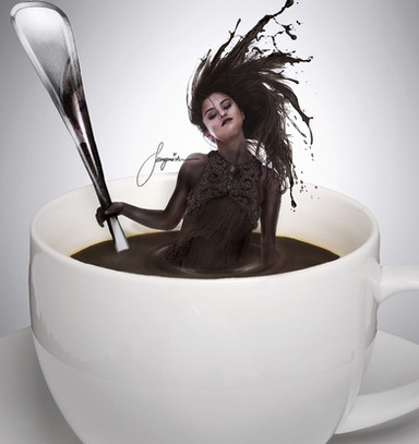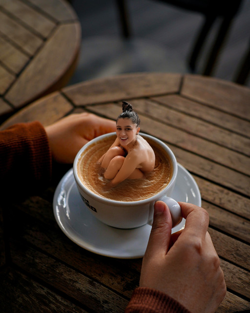 Shrunken woman in a mug of hot chocolate