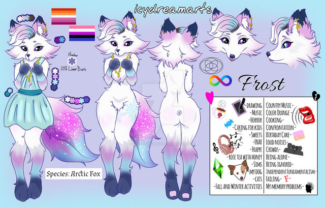 My only fursona as of right now frostbite! She was made by my friend and I gave her a full reference using KeshiOutContexts base! Thank you so much for the base :3Frostbite is a sassy girl who knows she’s boss and loves to show off