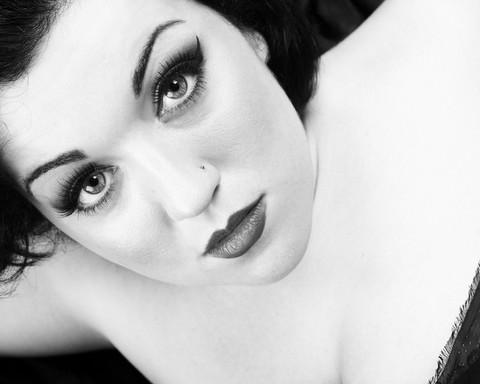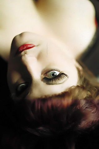 Interesting, creative effect. The contrast between the deliberately over-exposed areas with the natural tones and dark makeup works well.