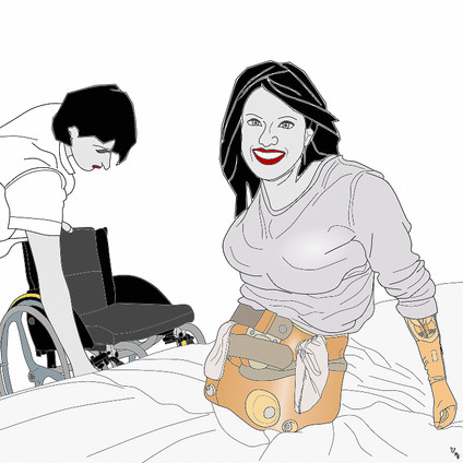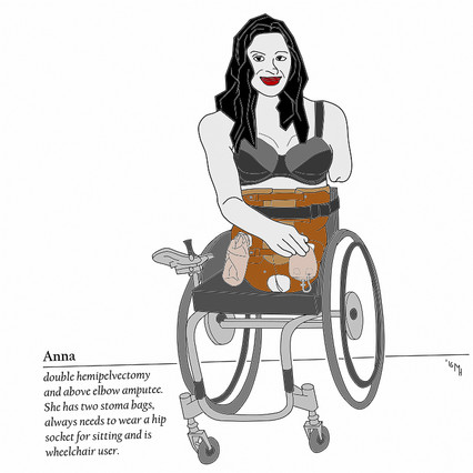 Maria - paralysed legs. She walks with two waist high braces (HKAFO) and crutches or is using a wheelchair.Anna - double hemipelvectomy and above elbow amputee. She has two stoma bags, always needs to wear a hip socket for sitting and is wheelchair user.