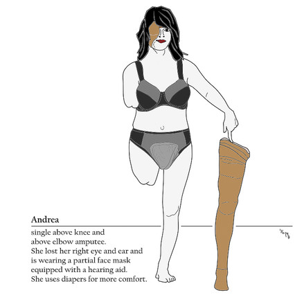 Andrea - single above knee and above elbow amputee. She lost her right eye and ear and is wearing a partial face mask. Uses diapers for more comfort.