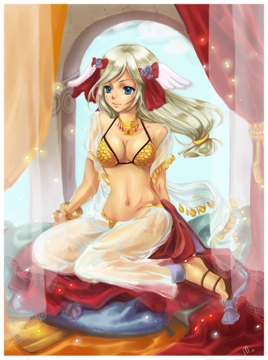 Very eastern, very pretty, but I just know this from having boobs, that top would have slipped up and left her breasts bare. If a woman wore that top and those kinds of boobs the lower half of it would have to support her much better; There would just have to be more cloth.