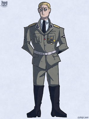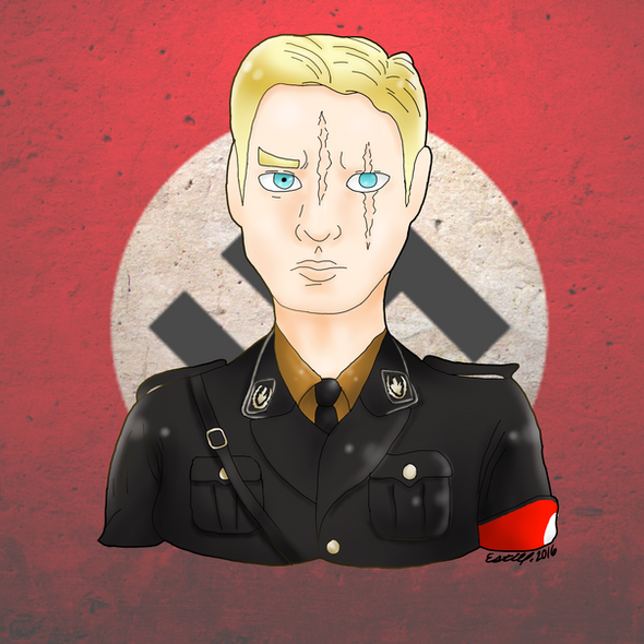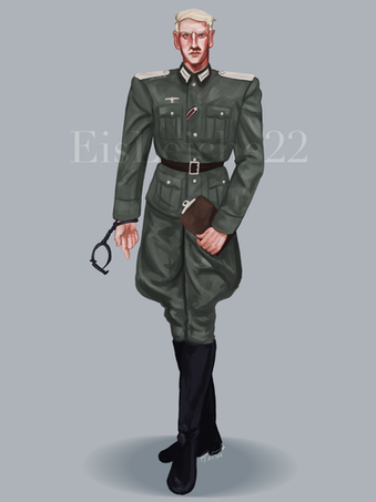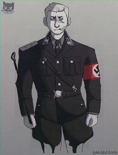 This is my character Sigmund. He is the main antagonist of my story about concentration camps. Sigmund serves as commandant of a camp and is one of my darkest characters. He is known for his coldness and brutality. He was born in Salzburg, Austria-Hungary on July 14, 1912. He grew up around music and as a result is skilled at the violin and piano. He also smokes cigarettes and struggles with alcoholism. The origin of his face scars are unknown, but it's said he got them before he started serving in the SS-TV. The only known awards he has are the Iron Cross 2nd Class. It's currently unclear how he obtained this. His whereabouts after WW2 are unknown, but it's likely that he either committed suicide or was killed by the allies or prisoners of the camp.