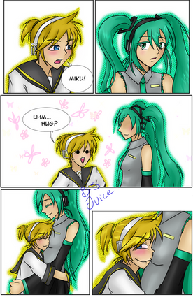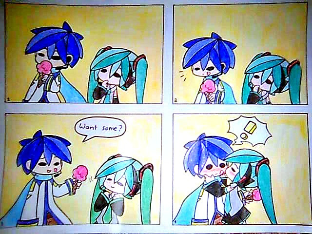 Miku looks like she was excited about kaito removing his jacket (if it wasn't obvious). i mean look at the last three panels and focus on mikus face. then you will see what i mean