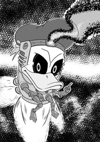 Here we have yet another character from the comicky world of Apeman and Monkeyboy, in the form of a mostly-metallic humanoid waterfowl with extensible limbs and a radio antenna that comes out of his head when he needs to pick up important transmissions or listen to Funk FM. He's sort of the avian equivalent of Inspector Gadget, only competent and vastly less irritating.The Dynamic Duckoid is a superhero from an alternative dimension, where human beings don't exist and anthropomorphic animals are the norm. He encounters Apeman and Monkeyboy while pursuing a particularly villainous villain between realities, and the three of them team up to foil the baddie - a mad turtle professor - before he frees hundreds of animal criminals from a secret prison located on an island somewhere in the Pacific Ocean and creates himself an army of genetically-modified evildoers. It's a saving-the-world-from-an-insane-amphibian kind of tale.