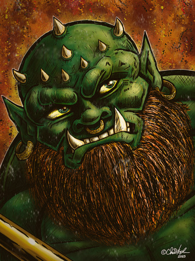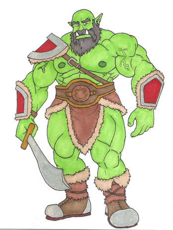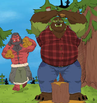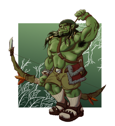 For the unfamiliar, Rab Glaschweg (to use his full name) is a highland orc whose general demeanour is one of wild-eyed snorting belligerence. It's a bit of an act, though – beneath the surface he's a thoughtful, learned individual with a talent for painting and a love of reading, but he feels compelled to play up the whole What-Are-You-Lookin'-At?-(Headbutt) thing in public because there aren't many highland orcs left in the world, and the world at large expects them to be loud, angry and inclined to nut adversity right between the eyes (or so he thinks). It should be noted, however, that it doesn't take much to provoke genuine crossness from Rab, and being whacked across the back of the head with a bit of old tree is exactly the sort of thing that can inspire irritability. Raguk, meanwhile, is a well-meaning and helpful chap with a regrettably unsubtle approach to problem-solving. Nurse, the screens!
