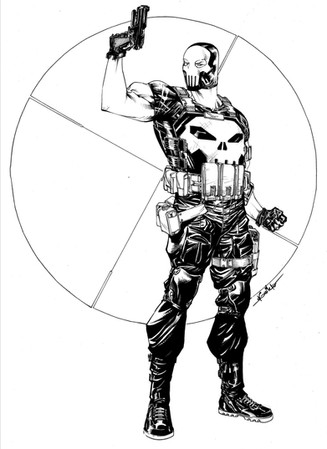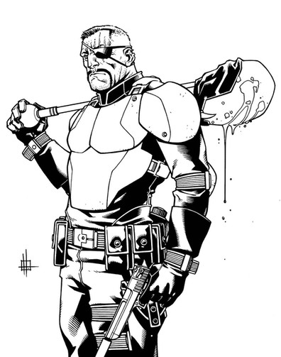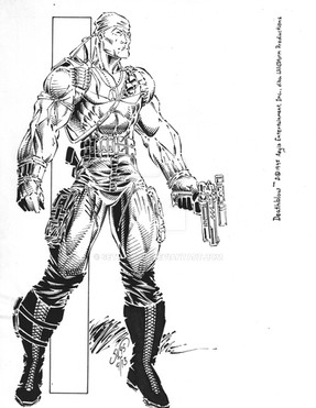Quickie pen and ink character commission. Essentially a re-animated Bullseye/Snake eyes/ Deathstroke. Not a very nice camper....8x11 pigma pens and brushes