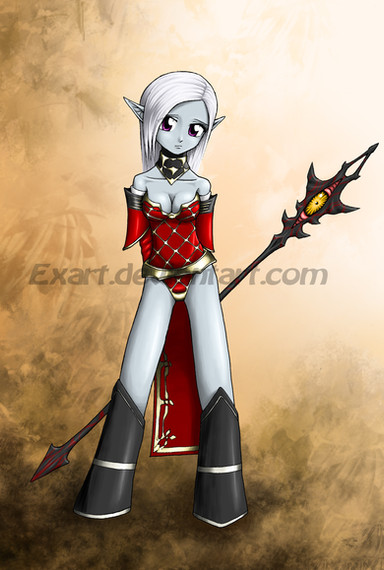 Half-elf/goblin mix? She's lovely. And the tat on her thigh is wicked. What is thy will, Your Highness?