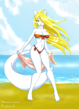 Wow. She's really cute. ^_^ I like this type of character more than Anthro characters (not that anthro's bad or anything), and you did a very good job on the design. The pose, lighting, outfit, and basically everything else is great!