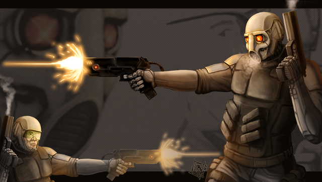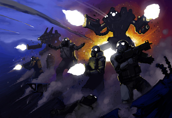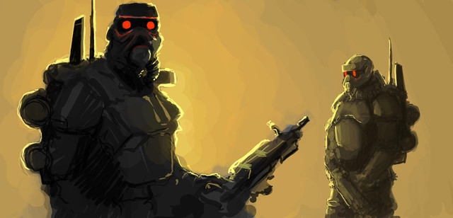 this is frickin awesome!! i love the design of the soldiers, weapons, etc and the lighting and overall atmosphere are amazing!! i actually really like the eyes, they really draw you into the picture and are almost haunting. the smokestacks (? that's what they remind me of) and the debris make the whole image very surreal. great stuff!! totally badass