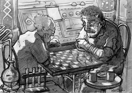 Ya know this is awesome man...this picture tells a story. I look at this and see a interesting inventor who creates all these gadgets in his lab like the one on the desk. Like a mad scientist kind of inventor who is really dedicated to his work and pretty eccentric at times. Maybe he is working on something really important, a personal project but keeps getting interfered with by businessmen whom he only creates work for because he needs the money to fund his wild invention....got so much thoughts form looking at your illustration.