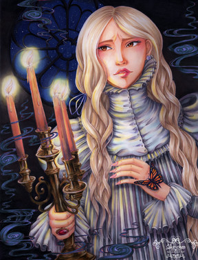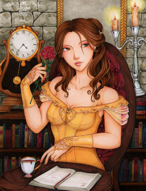 Au niveau du dessin, je me suis contentée du minimum, avec juste les mains pour y mettre un peu de vie... Pour la colo, je ne pensais pas qu'un monochrome de doré puisse avoir autant de nuance, donc je suis assez satisfaite! Au niveau de la tenue, j'ai mixé plusieurs robes des deux films n'arrivant pas à faire un choix.