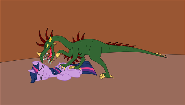 Twilight Sparkle (unicorn pony version) fighting a green t-rex by riding on it's back and ripping it's jaws apart with her hooves in a jungle, please?got requested by