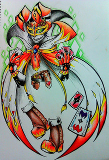 Actual tarot card designs are on the cards he's holding (death -in front-, wheel of fate, the devil)