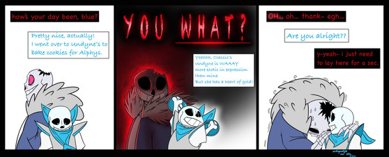 But also major kudos to Sans for getting up in his brother's face about this, especially when UF Paps is blatantly being kind to US Sans right in front of UF Sans. That probably sucks to see your jerk of a bro being nice to your alternate universe copy and still be the worst person to you.