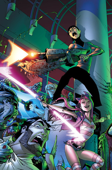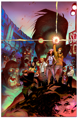 All-star poster of all the creator-owned characters of Rick Remender at the 2015 Thought Bubble comic convention.left to right: