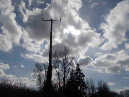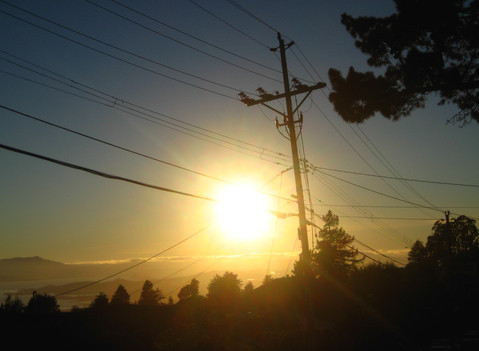 The sun caught shining from behind a power line pole.In reality, almost the energy we consume ultimately comes from the sun to begin. The sun shown down onto all the plants and algae long ago that died and transformed into coal, oil and natural gas. And it's the sun that heats the atmosphere, and the difference between heated and unheated regions is the ultimate cause of wind, and it's the sun and associated heat that evaporates the oceans, causing them to rain back down high in hills and mountains, feeding rivers that we dam up to harness the flow of.