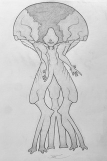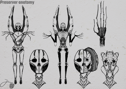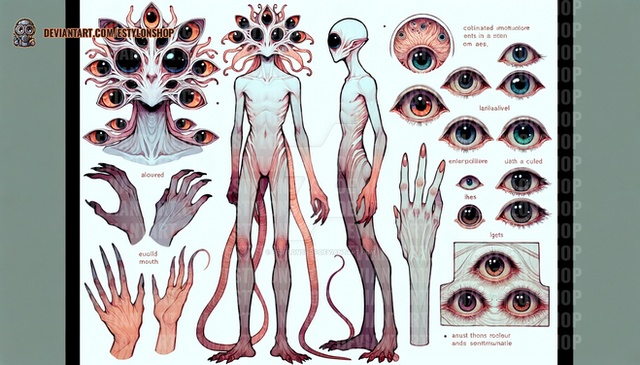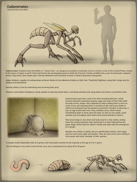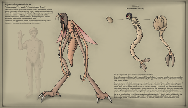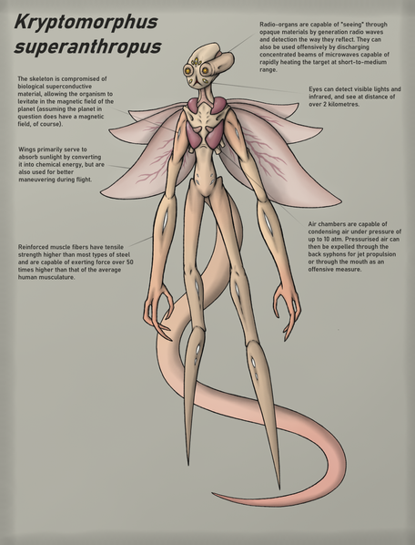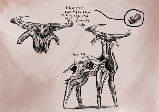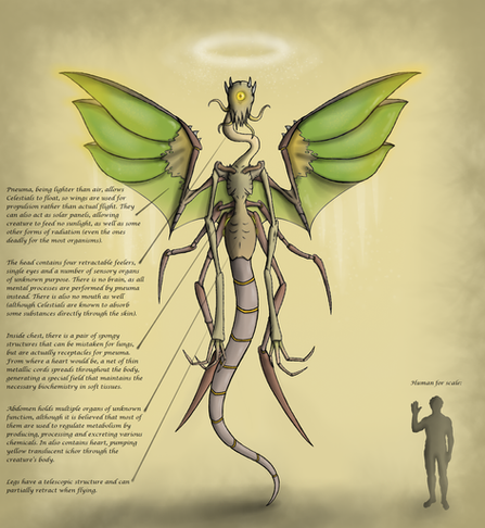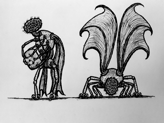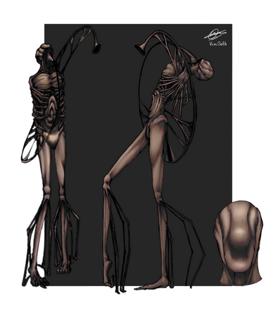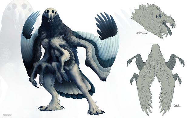 Back when I was figuring out their baseline design, I had an idea to give them these weird telescopic appendages what would retract while flying, but extend on the ground to serve as legs. It didn’t stick, however, and all of the subsequent iterations lacked the anatomy suitable for this kind of locomotion (except for "Nephilim ", but those have their own thing going on). For this reason, I decided to update the reference to reflect this change – but if you still like the original, quasi-bipedal look, here it is.