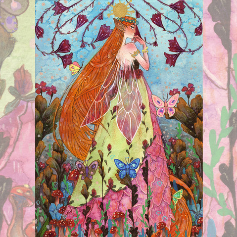 The mix of colors on the background is just beautiful, and the elements surrounding; the mushrooms, the flowers and the reef, are all very well done.