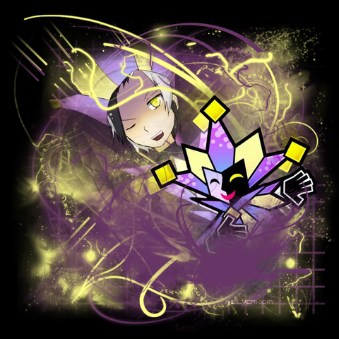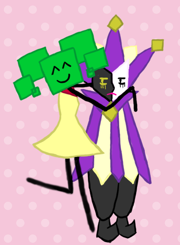 I love the poses--they look good, but I can't see any part of her legs, so I'm not sure if she's kneeling or standing(it looks like she's kneeling, due to Dimentio's position, however, and also due to how tall he is)... The shadowy parts without yellow dots coming from Dimentio, at least above his head, are also somewhat unclear - I can't tell what they are, but I think they might be part of his cape?