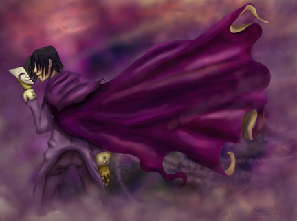 This is WONDERFUL! The entire scene, what with the smoke and the slightly disembodied look, looks like a dream. Dimentio's altered appearance is very nightmarish and sinister, which you portrayed and drew really well, and Mimi (for I assume it's her) looks pained and sad. Her whole body was done well, with the hair, head, and arm looking well-proportioned. The dress is a really good choice in colour, in my opinion, and goes well with who's wearing it and the scene around it.