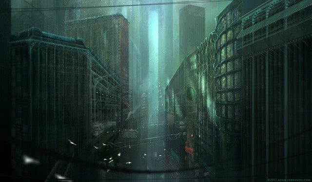 Firstly I had conception of total destruction, alien attack, the buildings are collapsin' or something..whatever. Finally created something smooth and silent.Concepts and sketchech traditionally, final piece with volito2.