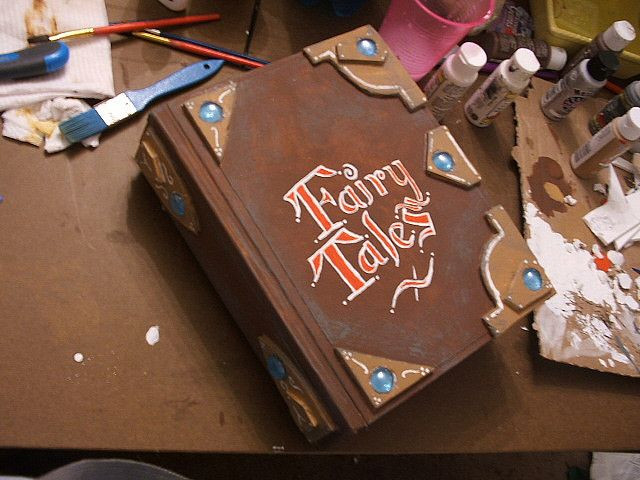 I wonder something, Would there be a way to mock up a couple pages like you have already done, but to make the book a pen/pencil holder? You know, have a hollow spot in the book where one could put pens/pencils...that type items? Given, it will take a little bit to make up the money, but I think that would be pretty kool. Perhaps also make the book look a bit aged. I love what you did with this one, but maybe have the book look like it has been around a long time. Some of the goldleaf is worn off a bit, maybe some darkening, like it has survived a fire. The red you used it delicious. And, as I am thinking about it, you might not be able to do a couple designed pages, since it will be hollow inside. Ah! Inspiration!! You could just decorate the inside cover! That would be awesome! Have the pictures of Little Red and Big Bad side by side in the front cover. That would be amazing!