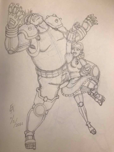 My final project for my 2021 art class: penciling and inking a scene of giant robots attacking a city - complete with frightened civilians and superheroes fighting back.I was quite the X-Men fan in my youth, hence my decision to model the robots after sentinels and to the superheroes' costumes to resemble those of the original X-Men (albeit with Y's instead of X's).