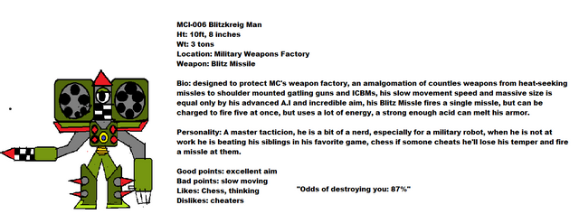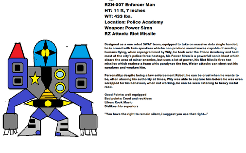 If you are a metahuman, mutant or otherwise, thses are the guys you should be afraid of, these are built for riot control, and they don't use foam or riot sheilds, they will litterly break you legs, break your arms and then stun you....in that order.When making this one, i imediately thought of Mega Man's Yellow Devil and Sonic Heroes' Metal Overlord and slpiced the two together!