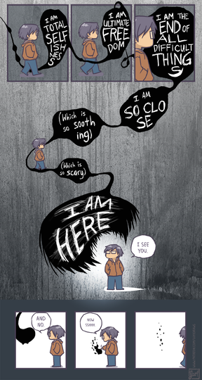 This comic helps me out a lot. I'm not saying I've had the worst past but I can't remember a day when I didn't feel agonizing pain, went a night without nightmares or wishing that I could give in and die. I have been through Hell and I'm not the only one. If you have depression you can overcome it, you can climb your way out of the void, because you are stronger than you realize. You have made it this far right? What doesn't kill you makes you stronger and now what doesn't kill you should start running. Believe in yourself.