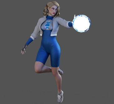 Blue Bombshell is going to be my first superheroine OC. I'm a big fan of Renderpretender, MrBunnyart, and everything Metrobay so I thought I'd play around with some heroine DiD, mind control, etc.Bridgette Hanson, a smalltown midwestern girl spent her youth growing up in rural America. Her life was horribly mundane until shortly before leaving home for college. While on a walk on a secluded nature trail, she discovered a very small meteorite that had crash landed the night before. Little did Bridgette know that this meteorite was home to high energy alien spores. Enthralled by the blue glow of the stone, she touched it only to set off a violent reaction and explosion which seeded the spores deep into her tissues. While the remaining spores were destroyed, those that remained in Bridgette began forming a symbiotic bond with her physiology. Her cellular membranes were reinforced and her metabolism overhauled to allow her immense strength, durability, and high energy output enabling her to fly and cast super-heated plasma projectiles at will.