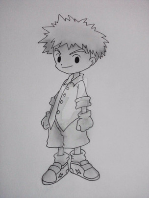 Another drawing of a child of one of the Chosen...this time, Taichi's kid. Again, I changed around his partner...that's a Frimon next to him.Disclaimer...I don't own Digimon!