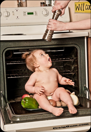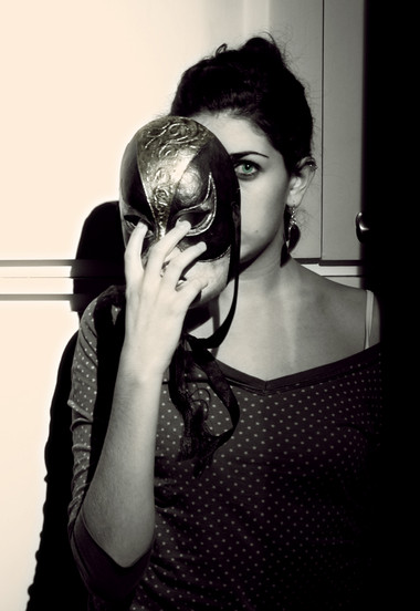 At first I blacked out her face to make it look as though she had removed it. However, I believe cropping way into the image had a much more dramatic effect without going overboard.