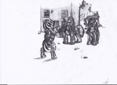For a guy who calls himself 'Mech' I really need to draw more robots. : /Another scene I felt like depicting from the fanfic Fallout Equestria: Project Horizons. Though the Robomination's (my name for it) appearence was sudden and short lived, it left an impression on me.