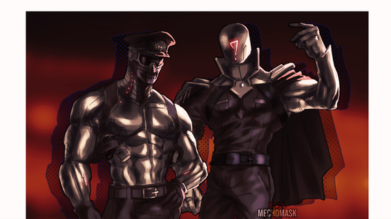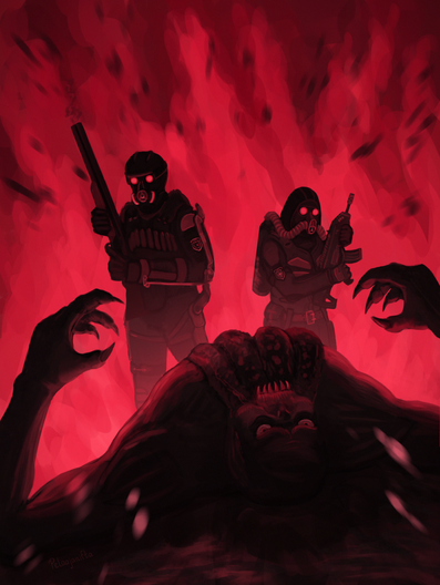 A final piece of artwork for my character concept class with my two space pirate lads, Geist and MaidjanThis took a while to complete, originally there was going to be just Geist sitting there until I remembered the requirement of there being two characters in the sceneic so, in popped Maidjan ripping appart two bastards.