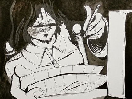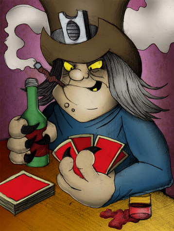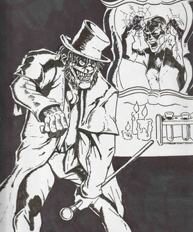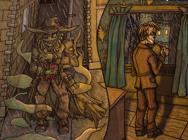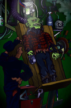 Lighting a cigar, the mad doctor looks over the reports on his desk. A massive window behind him gives a view of his factory, producing vibrant, green goo at a constant rate along with Dr. Krankcase’s other impressive inventions...A new drawing for my old story, "An Evil Day in the Life of Dr. Krankcase." As I updated it before including this drawing, I reread the story to clean it up slightly, though I still think this little fic is not bad. Now, it is my story that is most saturated with drawings, as it has two drawings despite being only one chapter long. I only hope that people are not confused by the difference in style, as my original "Evil Day' drawing was made nearly two years ago and I have altered my style since then.