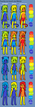 Friends: Plain friends are welcome to touch her arm, despite how uncomfortable Erika may seem about it. After a few seconds of it, she might swat your hand away. Because she has such interesting hair, people often ask to touch it and at this point, she's gotten tired of saying no, so she's fine with her friends touching the lower parts of her hair. The same goes with her tail.