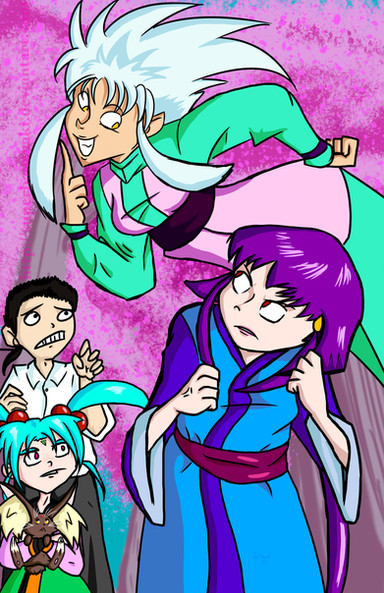 I did the Inking, colors and shading, along with a sketch up of the background. Kajishima sketched his three characters.