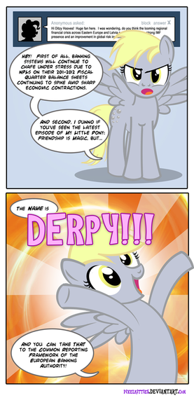 “...I’m a Wonderbolts Reservist an’ have medals an’ all from helping save Equestria, I really do not feel like a ‘Ditzy’ just because I have a problem with straight lines. And ‘Muffins’ is just... weird. Like, it’s a nice snack and all? Mrs. and Mr. Cake are always happy to see me coming, but it’s not an identity. I’m not a cook or a baker or anything, I work at the Post Office and some delivery companies 'cuz I can fly with huge piles of heavy stuff. I guess ‘Bubbles’, maybe, that’s my cutie mark on account of the flying with heavy stuff thing, but there are already two other Bubbleses in Ponyville, the yellow one with the tail bow and the one with the big head who sounds like Princess Twilight for some reason? The Whitetails call me ‘Bright Eyes See Every Direction’ whenever I go to their village in the woods, that’s pretty neat and they treat me nice ‘cuz they say I have ‘the wisdom of always finding the path of joy’ or whatever, but it’s kinda clunky. Anyway you can just call me Derpy ‘cuz my friends call me Derpy an’ I wanna be friends! Hey-- wanna go check out Sugarcube Corner?”