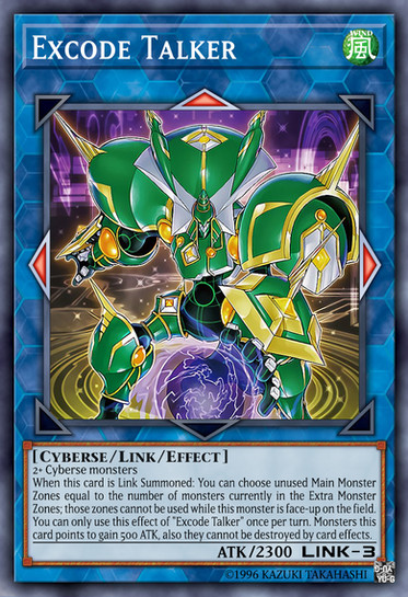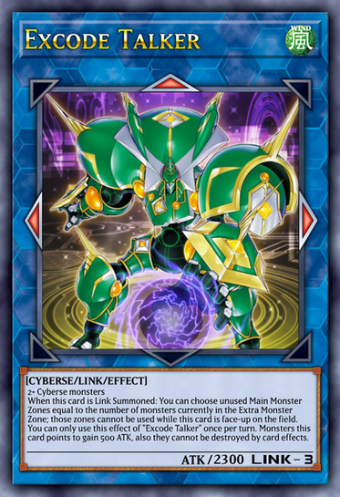 When this card is Link Summoned: You can choose unused Main Monster Zones, equal to the number of monsters in the Extra Monster Zones; while this card is face-up on the field, those zone(s) cannot be used. You can only use this effect of "Excode Talker" once per turn. Monsters this card points to gain 500 ATK, also they cannot be destroyed by card effects.